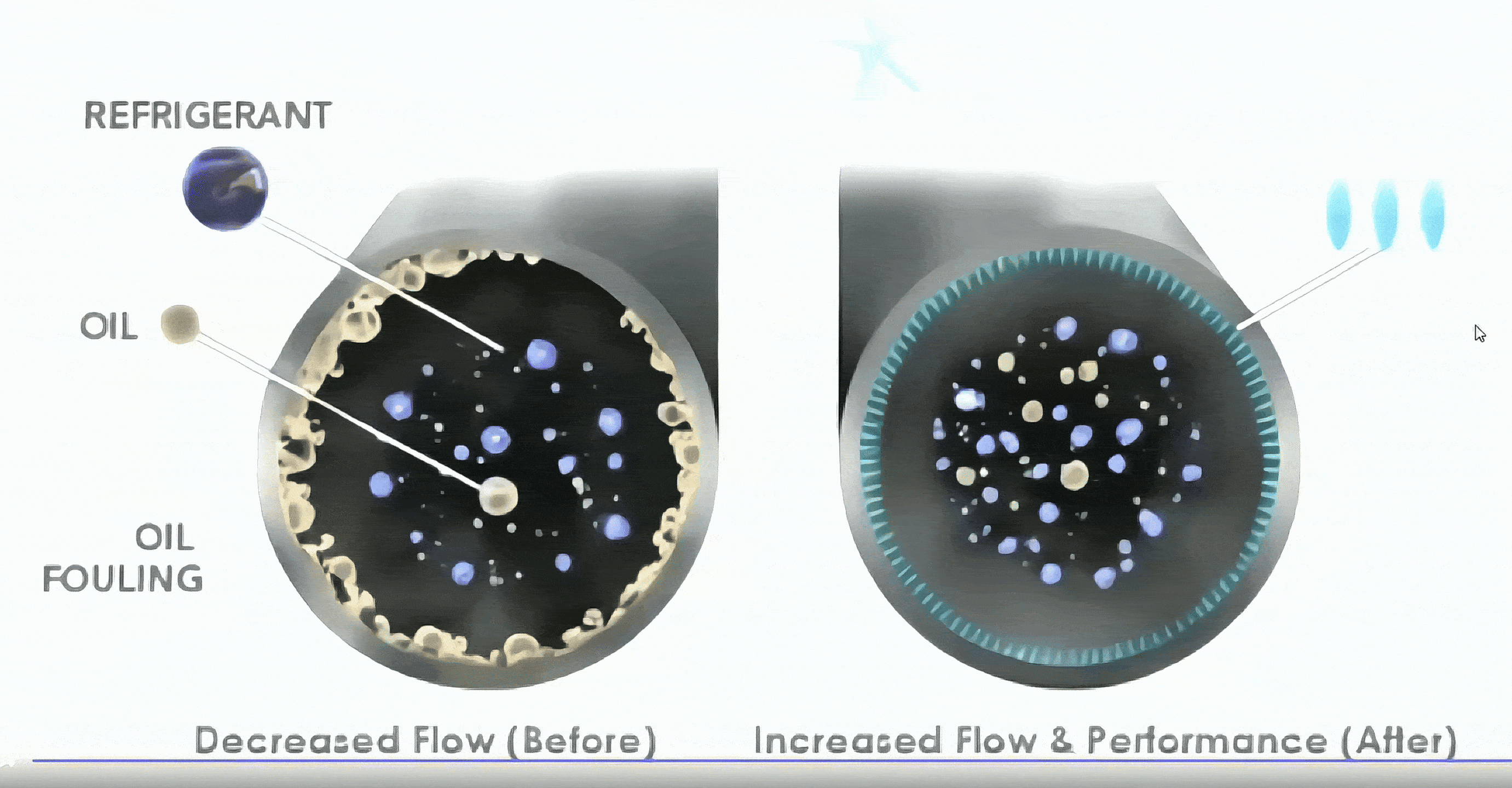 Over time, oil seepage from compressors coats heat exchanger surfaces, acting as a thermal barrier. This reduces heat transfer effectiveness, lowers system COP, and increases energy costs by up to 30%.